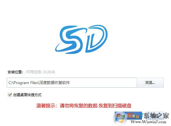 3、进入安装程序目录选择界面,请勿将程序安装到您有数据需要恢复的分区里。
