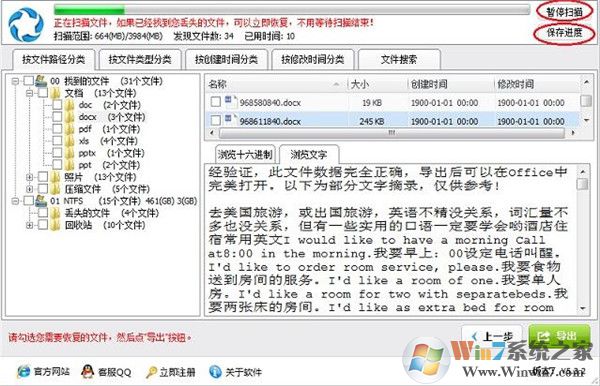 扫描过程中,您可以随时点击“暂停按钮“暂停扫描,查看是否找到了您丢失的数据,如果没有找到您丢失的数据,可以继续当前的扫描;或者点击”保存进度“然后退出扫描。