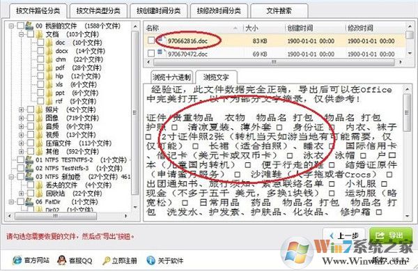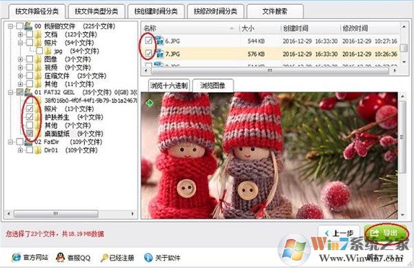 5、如果找到您要恢复的文件,可以在树形控件和列表控件里勾选您需要恢复的文件和目录。然后点击“导出”按钮,导出数据。