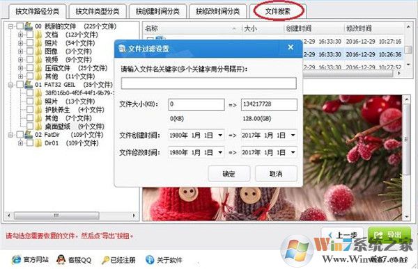 如果您找到的文件太多,或只需要恢复特定格式、名称的文件,或需要恢复指定大小的文件,或需要恢复某段时间创建、修改的文件,请点击"文件搜索"按钮,在弹出的“文件过滤设置”对话框中设定条件过滤文件。