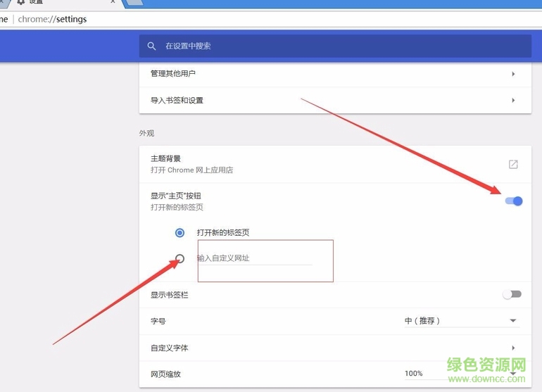 3.我们进入到设置界面后,可以在该界面找到“显示主页按钮”的选项,我们在下方的选项中勾选“输入自定义网址”选项,然后输入自己想要设置的网页链接。