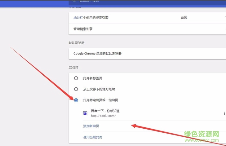 4.接下来我们鼠标滚轮往下滑,找到“启动时”选项,然后在下饭的选项中点击“打开特定网页或一组网页,然后输入想要设置的主页就可以设置成功了。