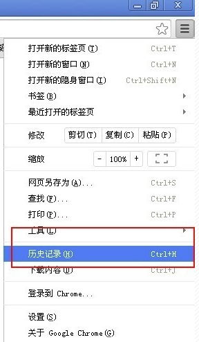 2.点击三个点标志后,界面会弹出菜单选项栏,我们可以看到有历史记录选项,我们点击该选项进入下一步。或者你也可以直接点击快捷键打开历史记录。快捷键ctrl+H。