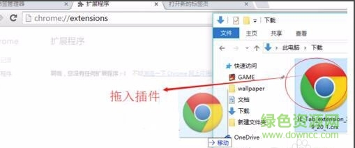 3.我们代开谷歌浏览器的扩展程序后,我们将第一步中下载好的IE Tab插件直接鼠标点击选中然后拖拽到谷歌浏览器中。如下图所示。