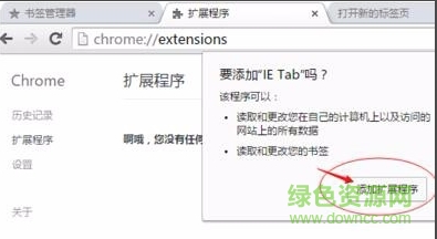 4.拖拽进来后谷歌浏览器会弹出提示框,提示你是否要添加“IE Tab”,我们点击下方的添加扩展程序就可以添加进来了。