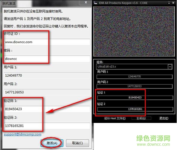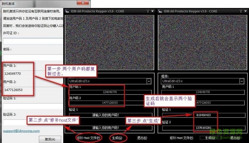 4.打开压缩包中的注册机(由于注册机会被误报,所以小编加密了,解压密码:www.xiuchufang.com,大家可以放心使用,亲测无毒),将”脱机激活“里面的用户码1和用户码2填入注册机对应位置,然后点击”修改host文件“,再点击”生成“,就会显示验证码