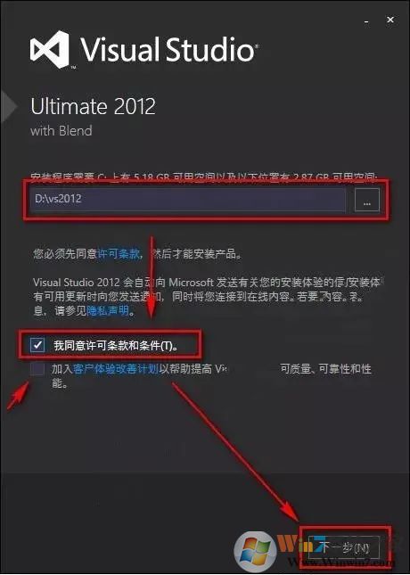 4.选择软件安装路径,勾选我同意许可条款和隐私策略,取消勾选加入体验改善,点击“下一步”