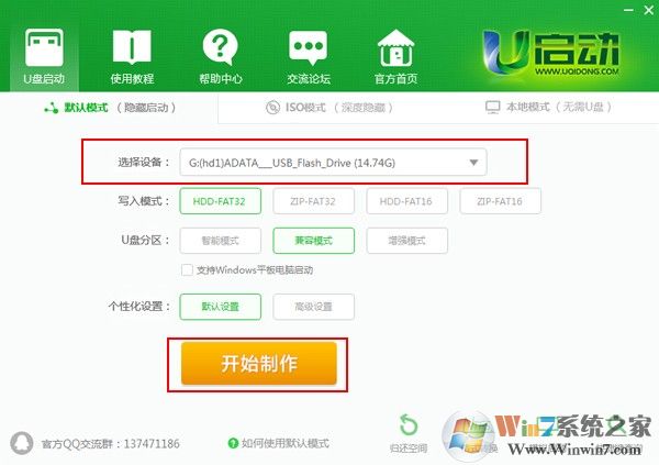 1、开u启动装机版,将准备好的u盘插入电脑usb接口并静待软件对u盘进行识别,由于此次u启动采用全新功能智能模式,可为u盘自动选择兼容性强与适应性高的方式进行制作,相较过去版本可省去多余的选择操作。故而建议保持当前默认参数设置,直接点击“开始制作”即可: