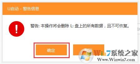 2、此时,弹出的警告窗口中告知会清除u盘上的所有数据,请确认u盘中数据是否另行备份,确认完成后点击“确定”: