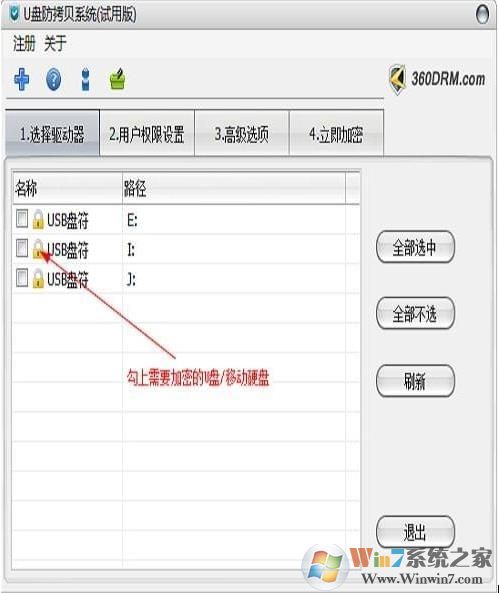 在U盘防拷贝系统中,勾选你要锁定的U盘盘符就可以,如下图: