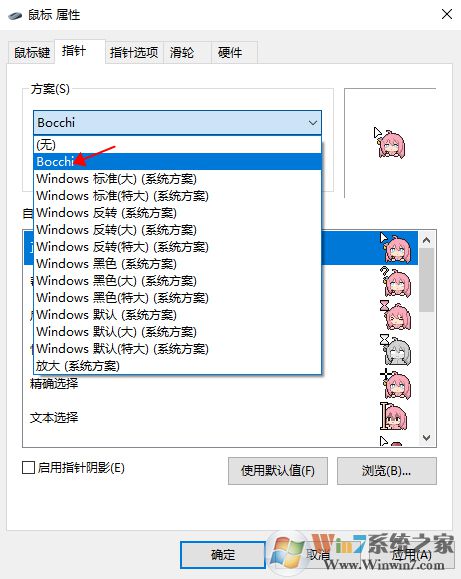 3、之后点击上方的“指针”选项,并在“指针”界面下的方案下拉框中选中Bocchi选项,最后点击下方的应用按钮即可完成鼠标样式替换