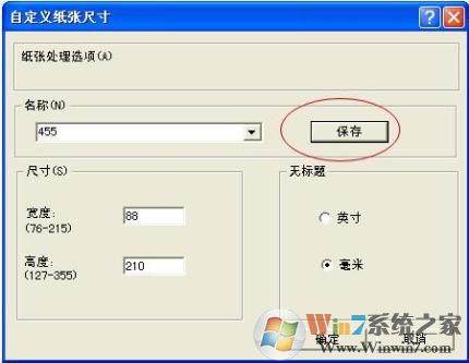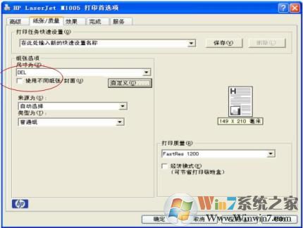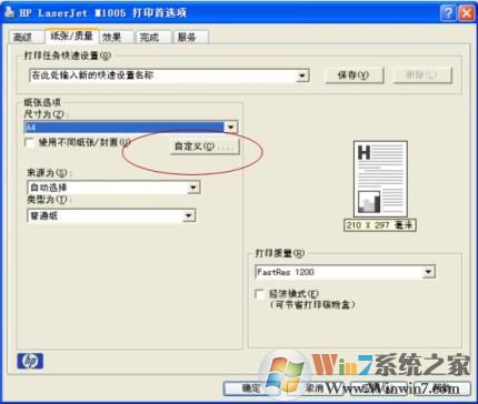3、在打印首选项中选择纸张/质量下尺寸为自定义纸张,然后点确定;