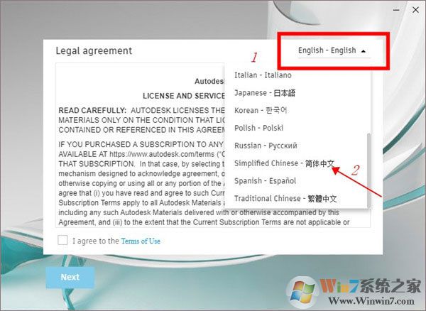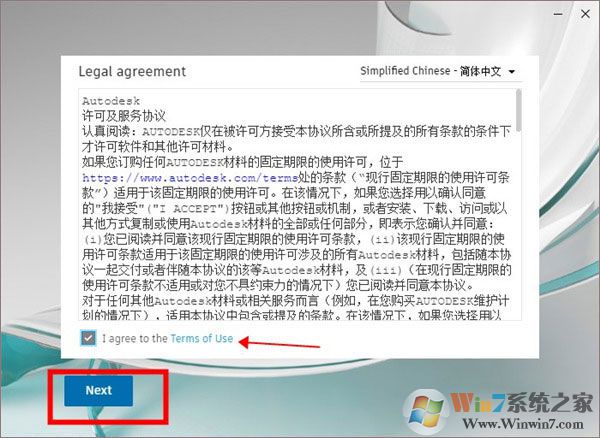 4、然后可以看到语言更改为中文,勾选同意使用条款,点击Next下一步;