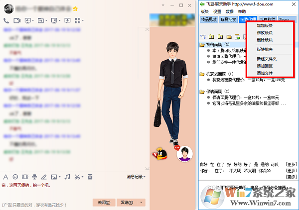 飞豆聊天助手分十个大版块,每个版块以文件夹方式进行细分,例如你有多块业务,可在聊天助手里添加美妆、服饰、食品、婴幼等等版块,又可以对每个版块以文件夹的形式细分,如售前报价、产品描述、售后咨询等等经常需要在聊天过程中用到的语句和内容。