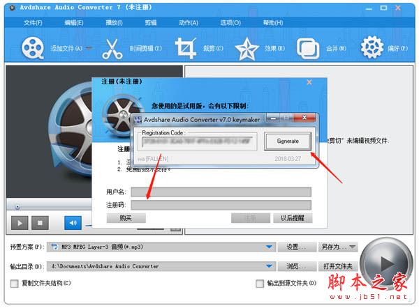 9、运行软件后,会提示需要注册,再运行安装包内的注册机,点击Generate生成注册码,复制到软件中注册,用户名随意填写,如kkx分享的截图所示: