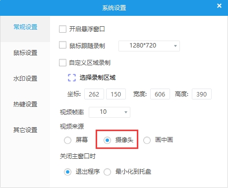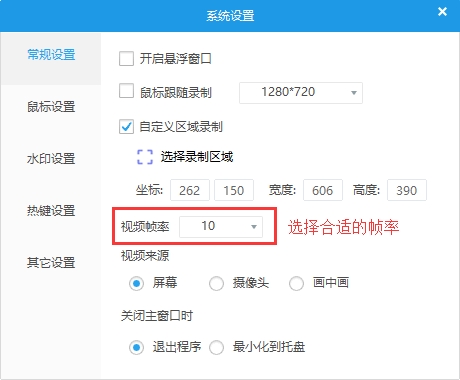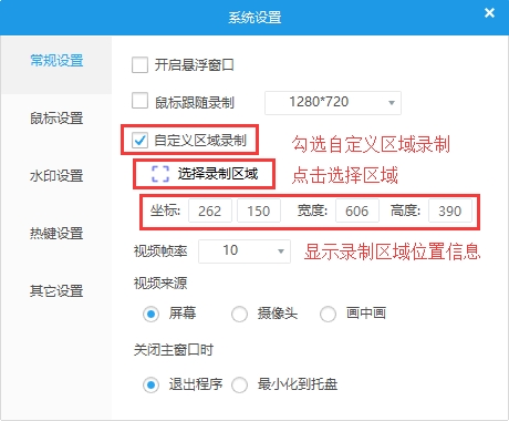 打开设置界面,点击常规设置,勾选自定义区域录制, 并且设置要录制的区域