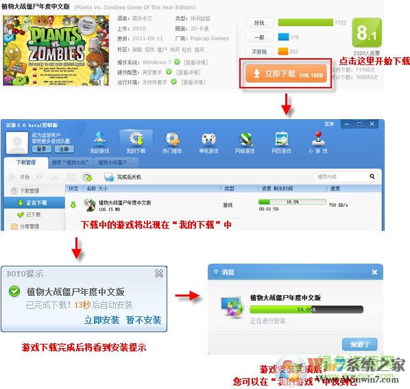 在逗游网中,单机游戏和网络游戏是需要下载并安装后才能玩的,下图将为您演示下载及安装过程。