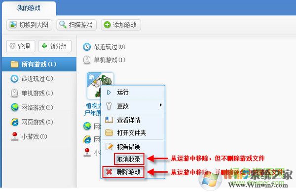 如果您想彻底删除游戏,请在【我的游戏】中右键点击图标在菜单中选择【删除游戏】,如果您只是想从逗游【我的游戏】中移除该游戏请选择【取消收录】。