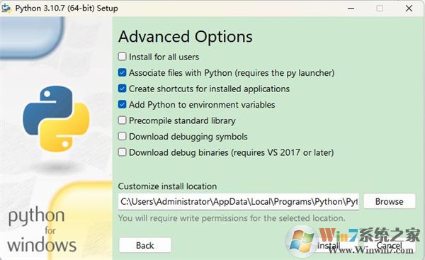 4、选择软件安装位置,默认安装在C盘,点击【Browse】可更改软件的安装目录,注意:安装路径文件夹名称均不能含有中文字符!小编这里将软件安装在D盘Python310文件夹下,然后点击【Install】
