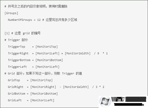简单来说,我们首先要告诉 GridMove 一共有多少个区域,然后要为每一个区域分别定义两个矩形的位置和大小,每个矩形要定义上下左右四条线的位置,因而每个区域要写八行。