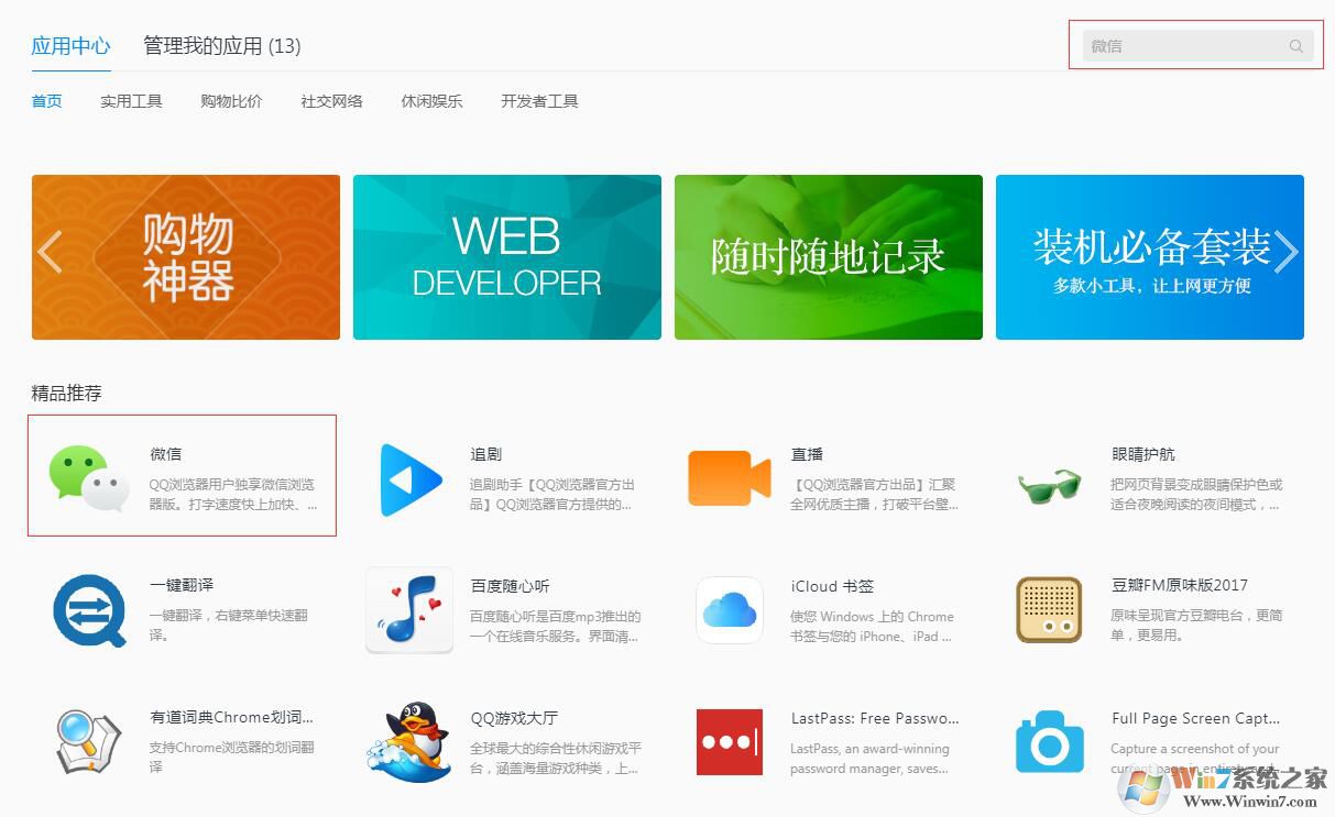 3、进入【应用中心】就能看到在首页的微信功能,如果没有则可以在右上角“搜索应用”中搜索微信;