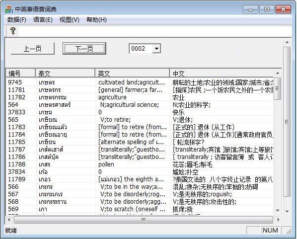如果查出来的泰文单词“编号”那儿为“0”,的话,直接在中文或英文处填写相应解释,回车,即完成一个新单词的添加