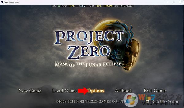 3、进入游戏后使用wasd键移动光标至Option,并按下E键