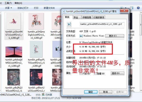下面是我转换完成以后的文件预览,可以看出,一个小Gif图片,有4.19M,质量非常高,并不会出现花屏等现象!