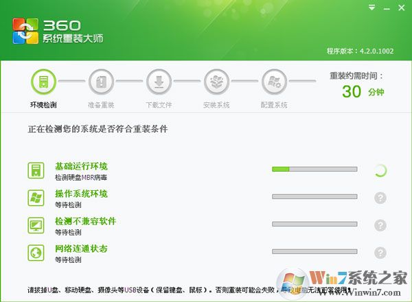 点击 "重装环境检测"按钮,程序将开始检测您的系统是否符合重装的条件: