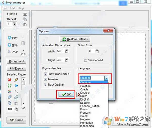 1、运行pivot animator,进入如下的选择语言界面,选择【Chinese】的中文语言,点击【OK】。
