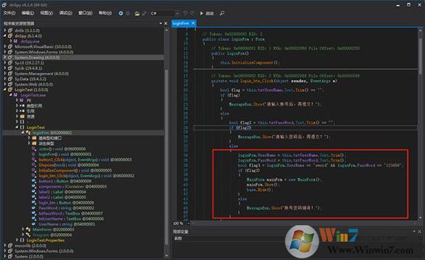 (1)启动dnSpy,[文件]->[打开],找到 LoginTest.exe 打开,dnSpy 会自动反编译,可以直接打开反编译后的源码: