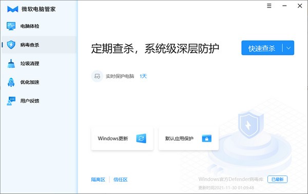 病毒查杀: 包含快速查杀、全盘查杀、自定义查杀、Windows 更新、默认应用保护等功能。