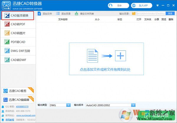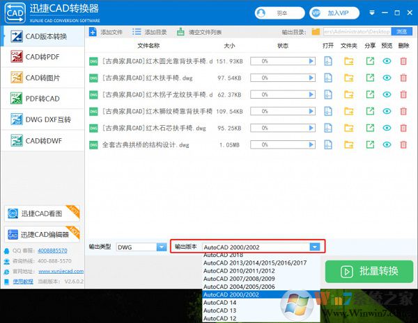 3、在转换器下方可以看到【输出类型】、【输出版本】的设置,点击【输出版本】在下拉选项中选择较低的CAD版本。例如,这里我们选择【AutoCAD2000/2002】版本。