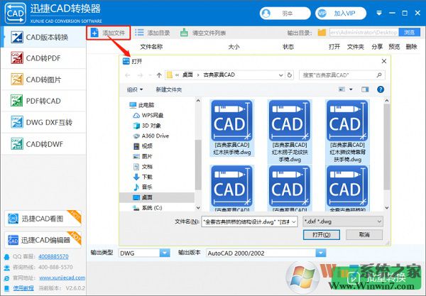 ①点击【添加文件】选项按钮,在弹出的【打开】窗口中找到需要的CAD图纸文件,按住【Ctrl】键然后点击鼠标右键一个一个选中需要的CAD图纸,可以批量添加CAD图纸文件到迅捷CAD转换器中。