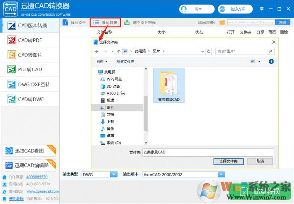②点击【添加目录】选项按钮,在弹出的【选择文件夹】的窗口中,找到需要的CAD图纸文件所存储的文件夹,点击【选择文件夹】按钮即可批量添加CAD图纸文件到迅捷CAD转换器中。