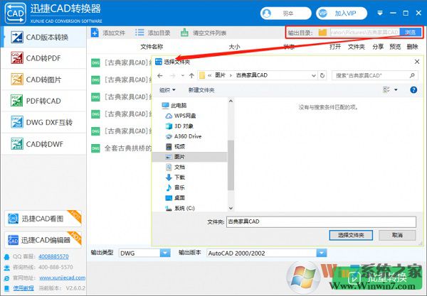 4、在【输出目录】处点击【浏览】按钮,可以选择合适的文件夹保存转换后的低版本CAD图纸。