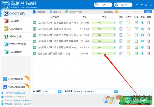 5、完成需要的转换设置后,直接点击【批量转换】按钮,进行CAD批量转换低版本操作,在【状态】栏里可以看到转换的进度,达到百分之一百就已经转换完成。