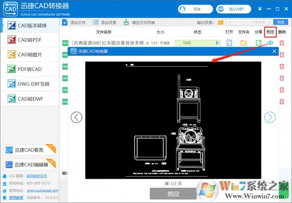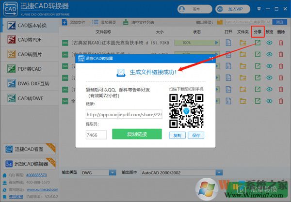6、CAD批量转换低版本完成后,我们可以直接在迅捷CAD转换器中对转换后的CAD图纸进行【打开】、【文件夹】、【分享】、【预览】、【删除】等操作。 以【分享】为例,显示如下: