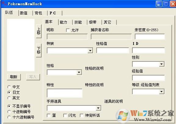 队伍修改:包括基本的种族、性格、手持道具、等级、经验、能力、技能、缎带、宠物球等