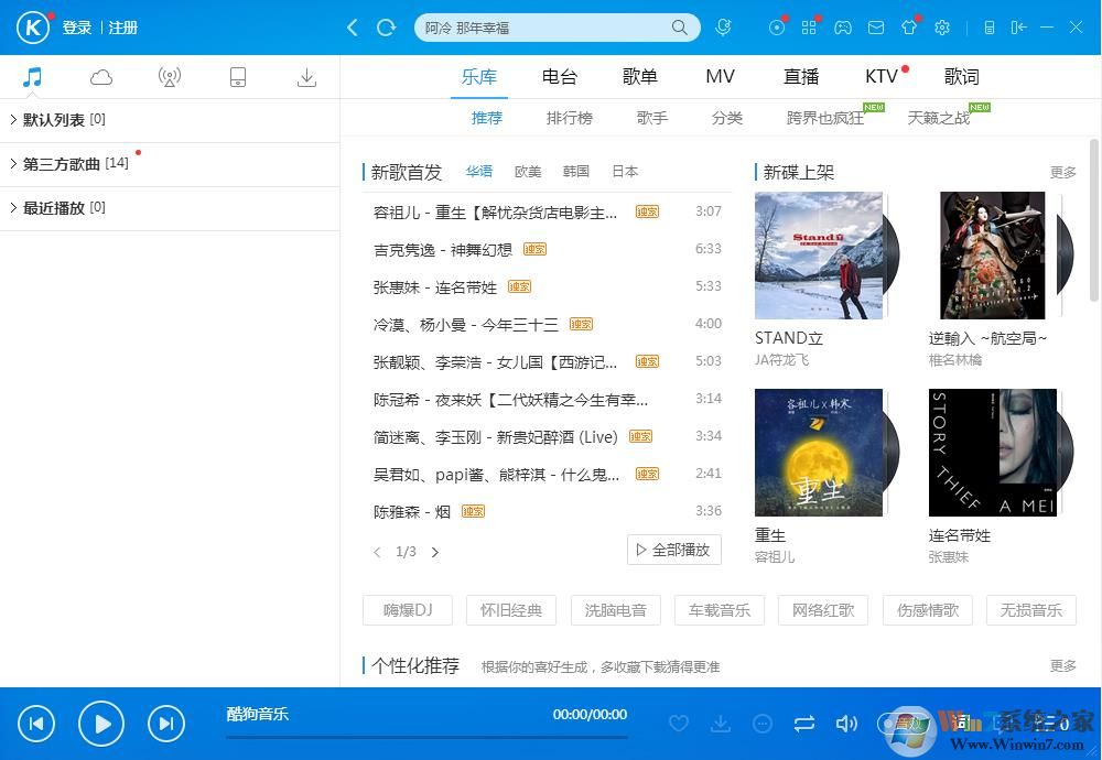 酷狗7随便听听个性频道 - 只要输入您喜欢的歌曲或歌手名称,酷狗7就可根据您的喜好为您推荐歌曲,听的越多,推荐越精准。