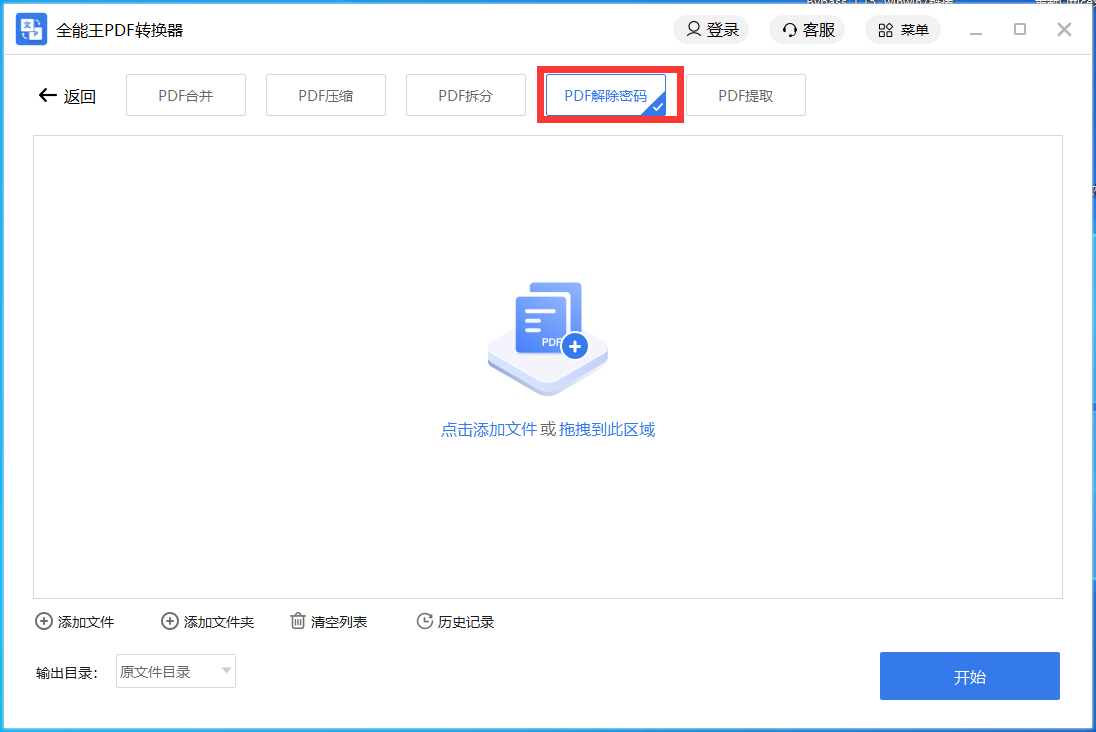 4、添加要解密的PDF文件,然后点击开始即可,转换完成。