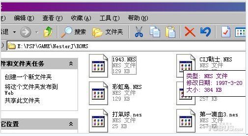 本例中,FC模拟器中已经包含了一部分FC游戏了,我们就不再另行拷贝了。FC游戏存放在PSP\GAME\NesterJ\ROMS文件夹下。