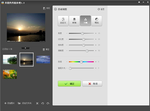 在批处理基础调整功能中,分为自定义模式和设定模式(鲜艳、清晰、明亮),即用户可以自定义微调各个参数选项,给予用户最大的自由度,随自己的修图喜好把握照片的风格;同时,也可以按照软件工具的给予参数设定处理照片。当然,在设定的模式中,参数并非固定死板的,仍旧可以微调,这两种模式主要包含六项照片调整项:亮度、对比度、饱和度、清晰度、色相、智能补光,基本覆盖了一张照片曝光、层次、色彩、锐度等调整要素,考虑很周到。
