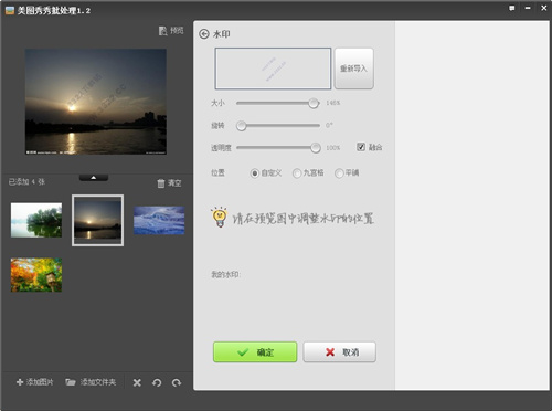 通过批处理工具的水印功能,我们能够对水印的大小、旋转、透明度以及水印位置进行自由控制,同时,在调节水印的时候,可以轻松预览,即时看到水印效果;此外,该工具有记忆功能,之前导入过的水印都留存在水印功能板块的下方,方便随时调用。