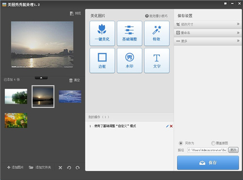 当以上的五大项批处理功能调整完毕确定时,我们需要对照片进行保存前的最后调整设定,美图秀秀批处理工具能够对照片的输出尺寸大小、照片格式、画质等级,是否重命名,存放位置进行设定。很显然,这些功能都是相当必要的,美图秀秀批处理功能怎么可能遗漏呢!最后,点击保存之后,照片的批处理功能就正式启动了,稍等片刻就能看到批处理照片的效果了!