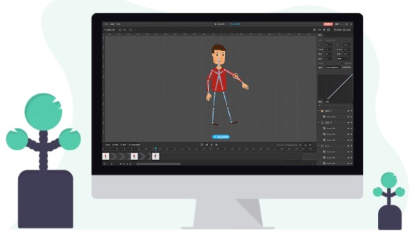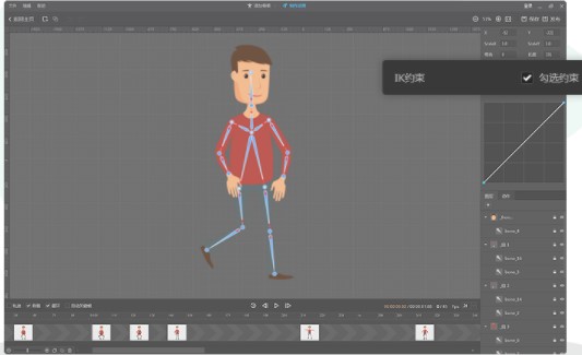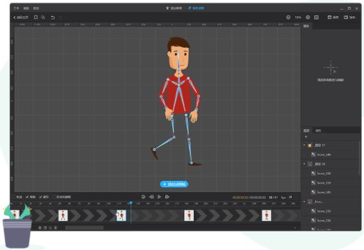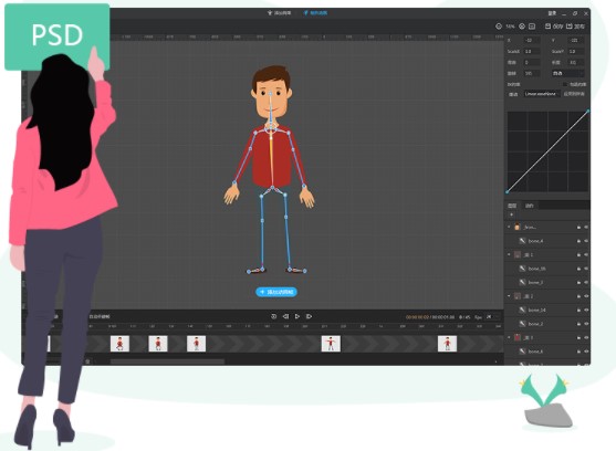 添加骨骼到图片后,可以控制骨骼让角色移动、任意角度旋转。其中曲线骨骼可以让角色的曲线变化更加圆滑流畅,从而让动画角色整体效果达到最佳。