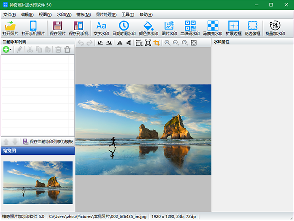 可以看到,软件中间区域显示刚刚添加得照片文件,软件左侧“当前水印列表”为空,代表此时未添加任何水印到当前照片当中;