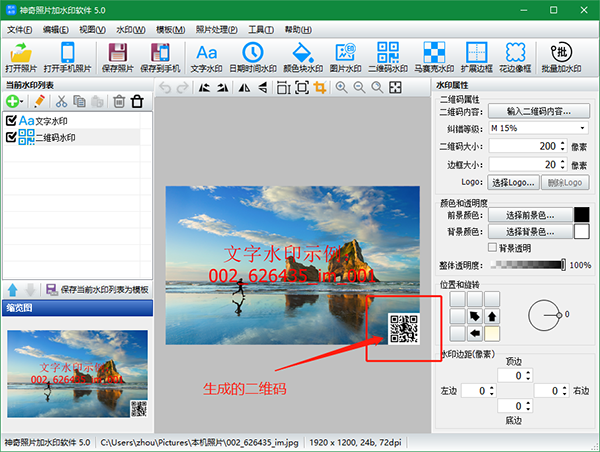 可以看到添加的二维码水印已经生成并显示到图片中,此时可以在右侧水印属性区域修改水印的位置、颜色、二维码大小、透明度、Logo图片、水印边距等信息;