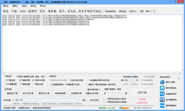 1、同时下载淘宝主图视频和描述的视频。2、下载主图、下载细节图、下载手机详情、下载属性图、下载其他图、下载评论图。