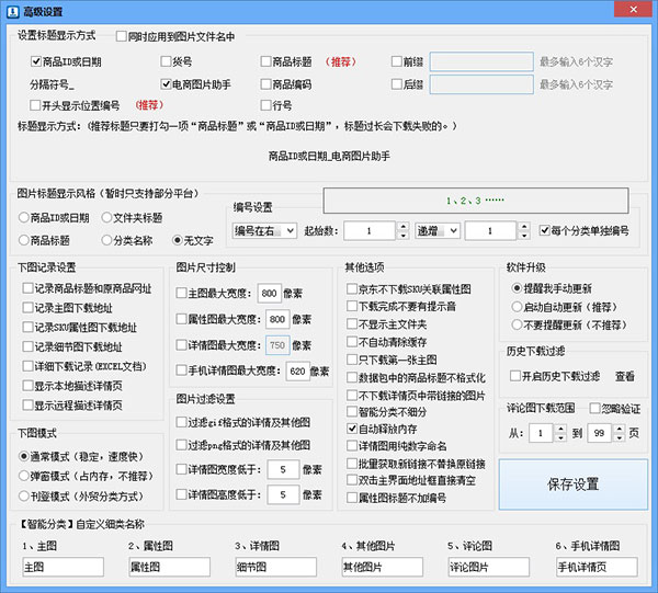 3、高级设置界面:在软件左上角【设置】-【高级设置】,在这里可以设置文件夹名、图片标题、图片尺寸控制、下载记录等。